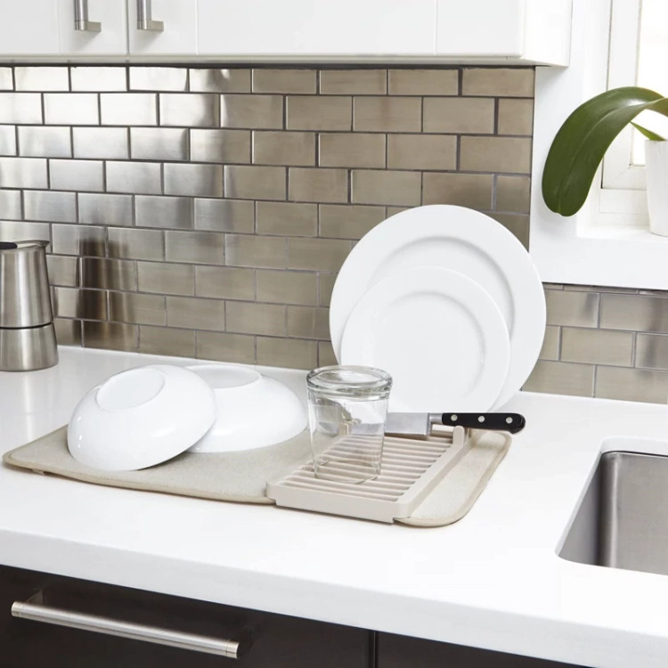 این محصول متشکل از یک پد نمگیر با ضخامت مناسب برای آبگیری ظروف شسته شده و یک استند برای قرار دادن ظروف مختلف با ابعاد کوچک نظیر بشقاب ، چاقو ، کفگیر و ... است . استند ظروف از جنس پلاستیک مقاوم و با کیفیت تولید شده که قابلیت جداسازی و همچنین اتصال آسان به پد در صورت نیاز را دارد ، بنابراین می توانید جهت شست و شوی نمگیر ، آن را از استند جدا نمایید . بارزترین ویژگی آبگیر ظروف کنار سینک را می توان قابلیت تاشدن پد بر روی استند و همچنین جابه جایی آن عنوان نمود ، بدین ترتیب که در صورت عدم نیاز به پد می توانید به سادگی آن را بر روی استند تا کنید تا فضای بسیار کمتری را داخل کابینت ، کشو و ... برای نگهداری اشغال نماید ، از سوی دیگر امکان جابه جایی آسان آن را داشته باشید . از این محصول علاوه بر کنار سینک ، بر روی کابینت ، هنگام سفر و کمپینگ نیز می توان بهره برد .