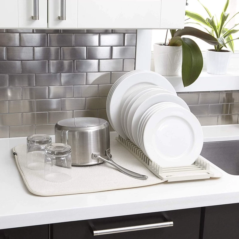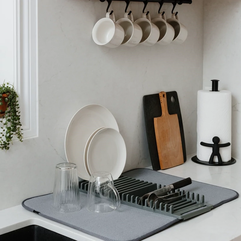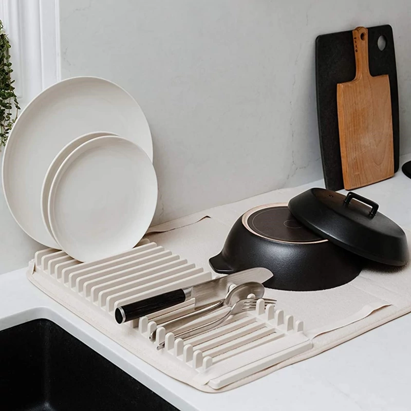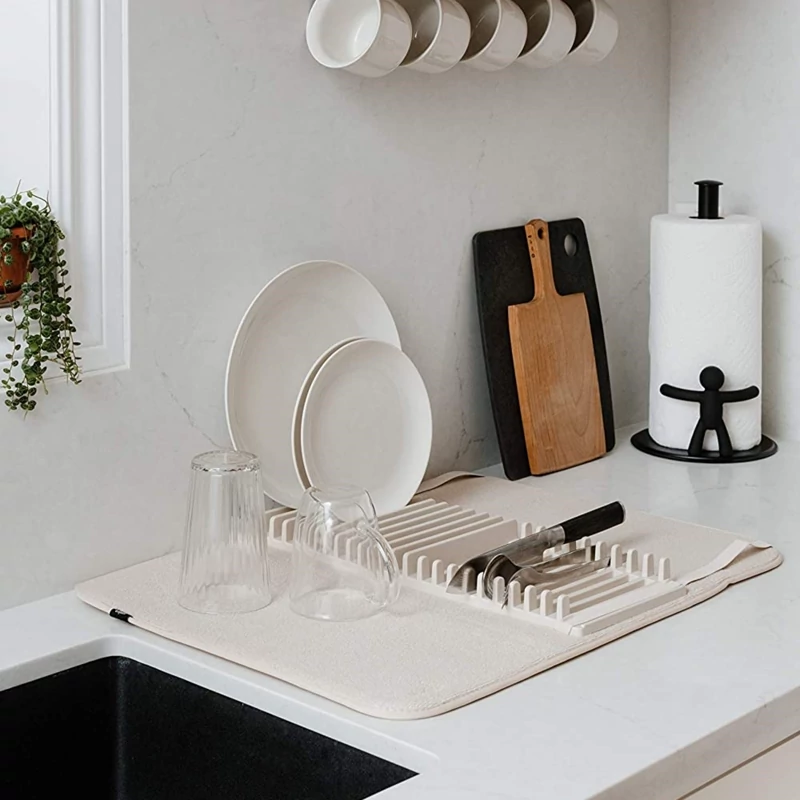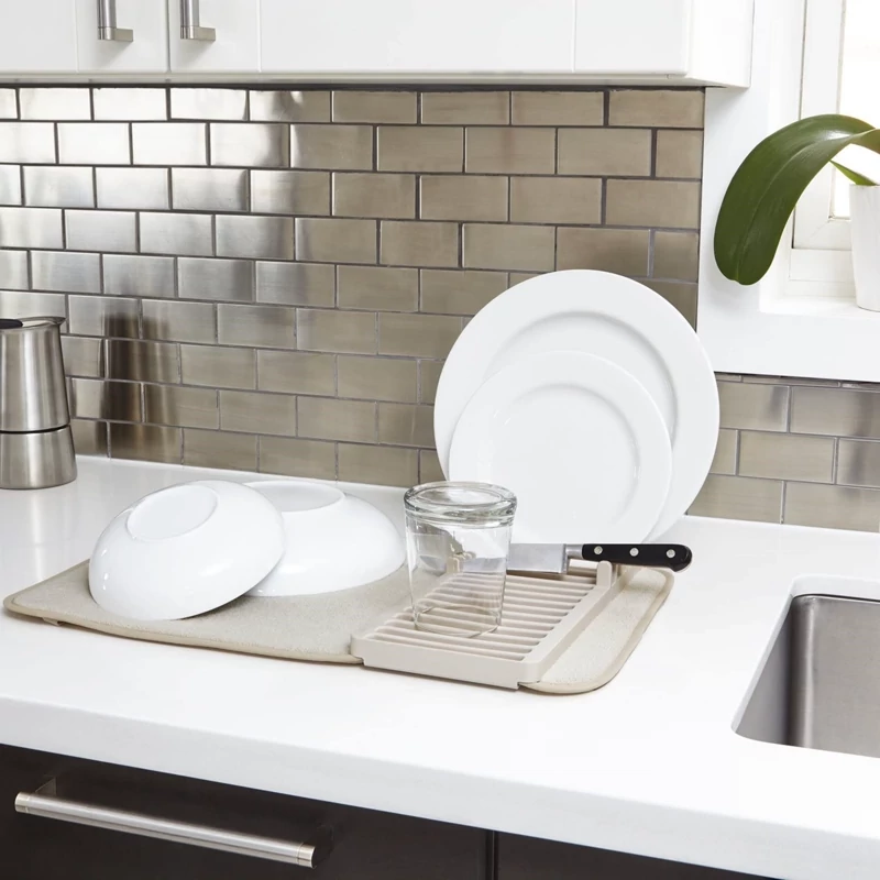 این محصول متشکل از یک پد نمگیر با ضخامت مناسب برای آبگیری ظروف شسته شده و یک استند برای قرار دادن ظروف مختلف با ابعاد کوچک نظیر بشقاب ، چاقو ، کفگیر و ... است . استند ظروف از جنس پلاستیک مقاوم و با کیفیت تولید شده که قابلیت جداسازی و همچنین اتصال آسان به پد در صورت نیاز را دارد ، بنابراین می توانید جهت شست و شوی نمگیر ، آن را از استند جدا نمایید . بارزترین ویژگی آبگیر ظروف کنار سینک را می توان قابلیت تاشدن پد بر روی استند و همچنین جابه جایی آن عنوان نمود ، بدین ترتیب که در صورت عدم نیاز به پد می توانید به سادگی آن را بر روی استند تا کنید تا فضای بسیار کمتری را داخل کابینت ، کشو و ... برای نگهداری اشغال نماید ، از سوی دیگر امکان جابه جایی آسان آن را داشته باشید . از این محصول علاوه بر کنار سینک ، بر روی کابینت ، هنگام سفر و کمپینگ نیز می توان بهره برد .