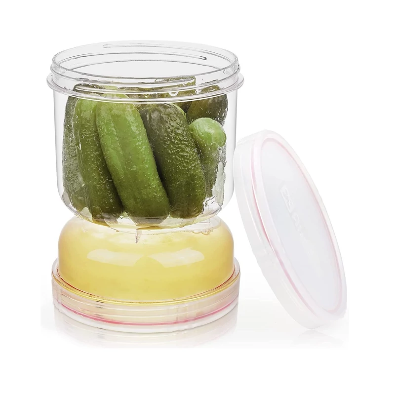 ظرف نگهدارنده خیارشور ، یک ظرف جدید با طراحی منحصر به فرد و البته عملکردی خاص می باشد . این ظرف استوانه ای شکل دارای دو محفظه با ابعاد متفاوت از یکدیگر بوده که بر روی یکدیگر قرار گرفته اند و از طریق یک خروجی در قسمت انتهای خود به یکدیگر متصل شده اند . محفظه بزرگ برای جای دادن خیارشور به همراه مایع نگهدارنده همراه آن طراحی شده ، به طوری که در حالت عادی یک ظرف خیارشور معمولی را خواهید داشت ، اما در موقع نیاز کافیست ظرف را به صورت عکس برگردانید ، به طوری که محفظه بزرگتر بالا و محفظه کوچکتر در پایین قرار گیرد ، در این حالت مایع همراه خیارشور ، از طریق خروجی به داخل محفظه زیرین منتقل می شود و خیارشورها در دسترس شما خواهند بود ، بدون اینکه تماسی میان دست شما با مایع وجود داشته باشد ، بدین ترتیب آلودگی ، انتقال چربی و رطوبت به سرکه و یا مایع همراه مواد غذایی جلوگیری خواهد شد و این یعنی علاوه بر دسترسی سریع و بسیار ساده تر با امکان استفاده تا مقدار پایانی مواد درون محفظه ، ماندگاری بیشتر مواد غذایی . ظرف نگهدارنده زیتون ، از هر دو طرف دارای دهانه با پوشش درب (باز و بسته شدن به صورت چرخشی) بوده و قابل استفاده برای نگهداری مواد غذایی مختلفی نظیر خیارشور ، زیتون ، سیر ، پنیر و انواع ترشیجات می باشد .