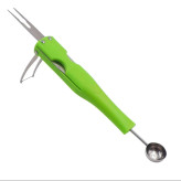 اسلایسر هندوانه چند کاره ، یک ابزار چند منظوره جدید آشپزخانه است که درواقع نه یک اسلایسر تنها ، بلکه باید گفت چهار ابزار در یکی ، برای دسترسی ساده تر و البته تسریع در عملکرد می باشد . این کالا مجهز به یک تیغه اسلایسر برای برش یک دست و یک اندازه هندوانه است که به صورت تاشو در زیر دسته تعبیه شده ، برای دسترسی به آن کافی است سری تیغه را به سمت بیرون بکشید و پس از استفاده ، مجدد در جایگاه خود قرار دهید . اما در سوی دیگر کاتر برش زن هندوانه ، یک اسکوپ کوچک به قطر 1.8 سانتی متر قرار گرفته که برای تزیین و میوه آرایی کارایی دارد . اما دسته کالا ابزار دیگری نیز درون خود جای داده ، وقتی به دو طرف دسته دقت کنید ، دو زبانه استیل خواهید دید که یکی از آنها چاقو و دیگری چنگال است که به صورت تاشو داخل دستگیره تعبیه شده اند ، برای استفاده از آنها می توانید هر کدام را از قسمت مشخص شده به سمت بیرون بکشید و پس از بهره برداری به جایگاه خود برگردانید ، به همین سادگی . تیغه های استیل و دسته تولید شده از جنس پلاستیک فشرده پایان بخش معرفی یک ابزار چندکاره کاربردی است که می توانید از آن برای برش ، سرو و تزیین میوه هایی نظیر هندوانه ، گرمک و ... بهره ببرید .