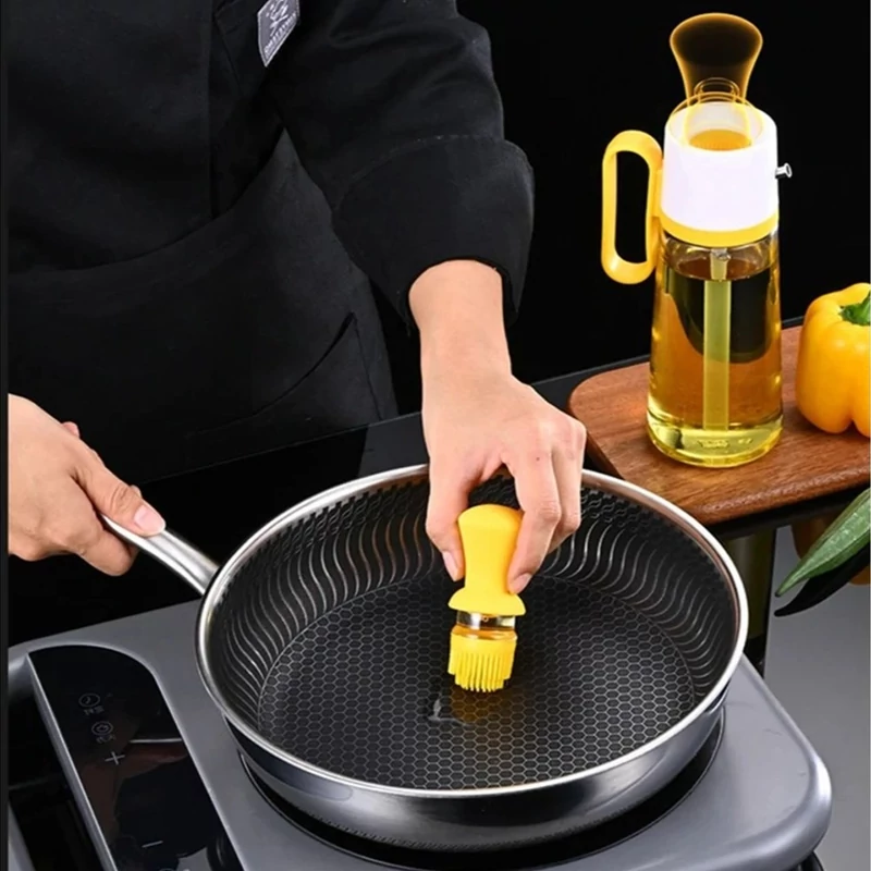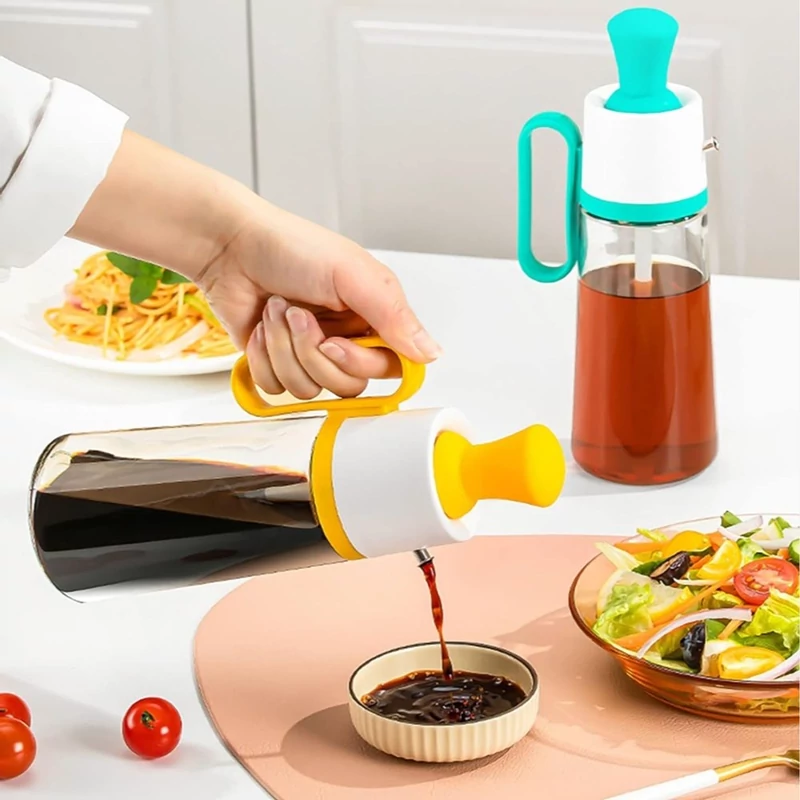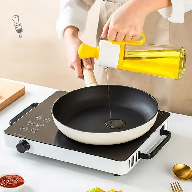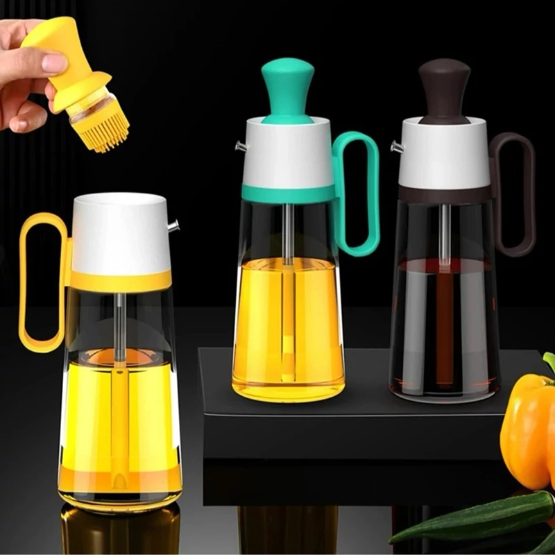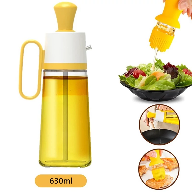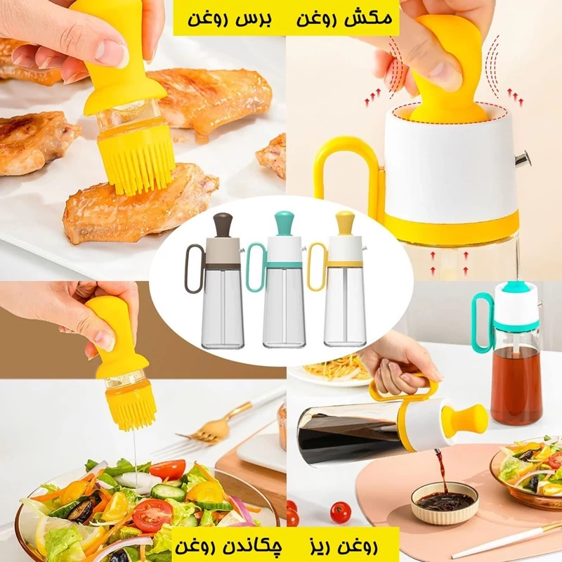بطری و فرچه روغن ریز دوکاره ، یک محصول جدید ، کاربردی و البته حرفه ای برای آشپزخانه شما با طراحی ظاهری منحصر به فرد و زیبا که می تواند علاوه بر متقاعد کردن سلیقه ، کمک بزرگی برای شما محسوب شود . این کالا در نگاه اول یک بطری شیشه ای با سری تولید شده از جنس پلاستیک فشرده مقاوم می باشد که جلوه ای خاص را برای آن پدید آورده . ظرفیت محفظه برابر با 630 میلی لیتر است که می توانید از آن برای روغن ، سرکه ، آبلیمو و مایعاتی از این قبل استفاده کنید . خروجی شیشه روغن ریز بر خلاف بسیاری از نمونه های مشابه دارای بیرون آمدگی می باشد که سبب خروج آسان تر روغن از داخل شیشه می شود . درب محفظه قابلیت باز و بشته شدن به صورت چرخشی برای پر کردن آسان تر را دارد ، اما وجه تمایز کالا با دیگر نمونه های هم ردیف خودش را باید فرچه تعبیه شده بر روی دهانه سری روغن ریز عنوان کرد ، فرچه ای سیلیکونی همراه با محفظه شیشه ای دارای ظرفیت 9 میلی لیتر . در حالت عادی فرچه بر روی دهانه قرار دارد ، ولی در صورت نیاز می توانید دستگیره آن را کمی فشرده کرده و رها کنید تا روغن را به داخل محفظه خود بکشد ، حالا آن را جدا کرده و به سادگی سطح مواد غذایی و ظروف را به صورت بهینه به روغن آغشته کنید ، به همین سادگی . از بطری روغن آسان ریز می توانید علاوه بر روغن برای مایعات دیگری نظیر آبلیمو ، آبغوره ، سرکه و یا برخی از سس های مایع نیز استفاده کنید .