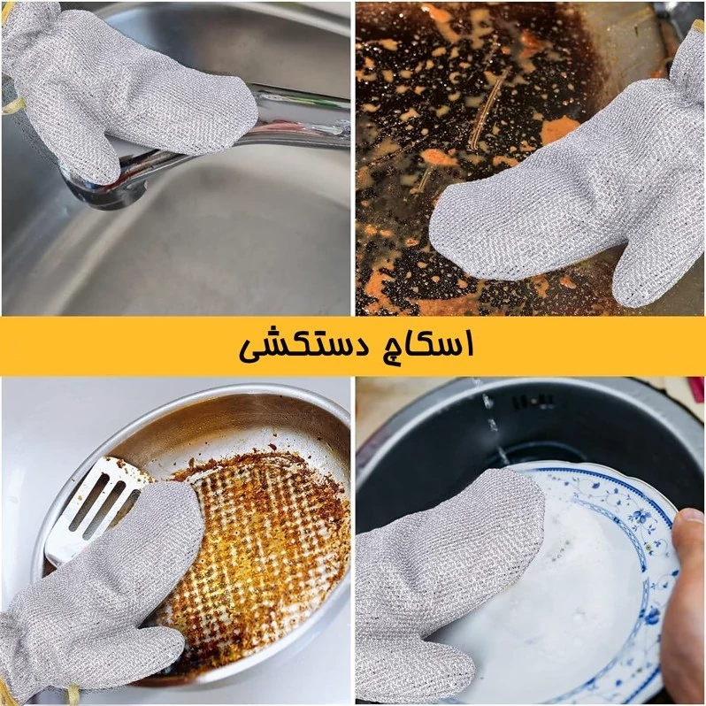 اسکاچ دستکشی بسته 2 عددی ، محصولی جدید برای شستشوی ساده تر و با کیفیت بیشتر ظروف می باشد . این کالا یک جفت دستکش با لایه داخلی محافظ ضد آب می باشد که مانع از نفوذ آب به فضای داخلی و در نهایت خیس شدن دست می شود . لایه رویین ،پارچه ای است که بر روی سطح آن طراحی شبکه ای به شکل یک اسکاچ سیمی ایجاد شده تا قابلیت شستشوی سطح ظروف به بهترین شکل ممکن را پیدا کند با این تفاوت که نمی توان آن را یک اسکاچ سیمی و یا سیم ظرفشویی دانست ، چراکه لطافت بیشتری را نسبت به سیم ظرفشویی دارد . تسلط بیشتر بر روی ظروف در حین شستشو از جمله ویژگی های اسکاج دستکشی به شمار می رود که از آن می توانید برای شستشوی ظروف مختلف و سطوحی نظیر سینک استفاده کنید .