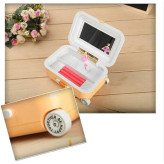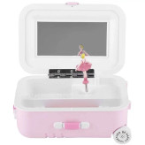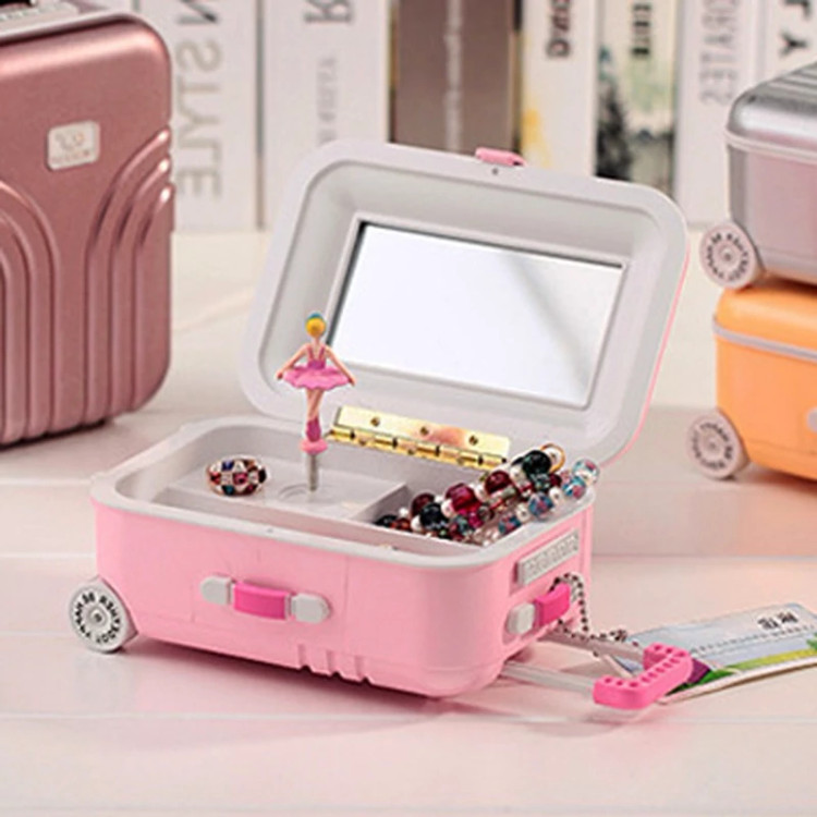 جعبه جواهرات موزیکال طرح چمدان ، محصولی متفاوت با طراحی فانتزی و بسیار زیبا است . این جعبه دارای آدمک گردانی می باشد که همراه با پخش موزیک به دور خود می چرخد و جلوه ای زیبا را پدید می آورد . موزیک چمدان به صورت کوکی است و نیازی به استفاده از برق و یا باطری ندارد ، تنها کافیست چمدان را کوک کنید و درب آن را باز کنید . در قسمت داخلی درب ، یک آینه تعبیه شده که امکان استفاده از چمدان برای نگهداری از لوازم آرایشی را نیز فراهم نموده ، علاوه بر این بخشی از پوشش داخلی جهت قرار دادن آسان انگشتر طراحی شده است . این چمدان در رنگ های متنوع و زیبا متناسب با سلیقه های مختلف ارائه می شود.