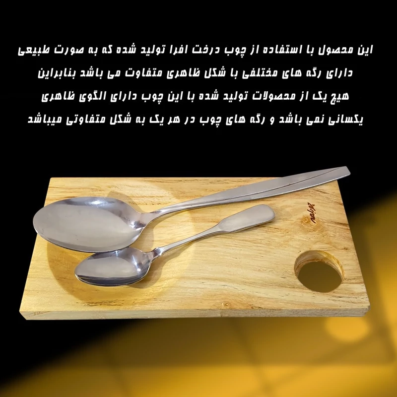 زیر ملاقه ای چوبی کنار گاز افرا ، نمونه ای جدید از یک زیر قاشقی چوبی با طراحی ظاهری متفاوت ، چشم نواز و البته کاملاً طبیعی است . این کالا یک زیر قاشقی تخت ، تولید شده از جنس چوب افرا می باشد که در عین مقاومت دارای رگه های طبیعی چوب است که زیبایی منحصر به فردی را برای کالا به وجود آورده . قسمت جلوی زیر ملاقه ای کنار گاز قوسی به سمت داخل ایجاد شده تا به هنگام قرار گیری سری قاشق و ملاقه بر روی آن ، ثابت شوند و به سمت بیرون نیافتند . طراحی تخت کالا ، امکان جای گیری بر روی سطح به شکلی ثابت را فراهم آورده به دور از احتمال برخورد با آن در حین آشپزی و افتادن . قاشق ، ملاقه ، کفگیر و چنگال آشپزی را می توانید بر روی سطح آن قرار دهید ، در کنار اجاق گاز و یا روی کابینت برای دسترسی آسان و سریع به دور از کثیف شدن سطح و یا آلودگی ابزار .
