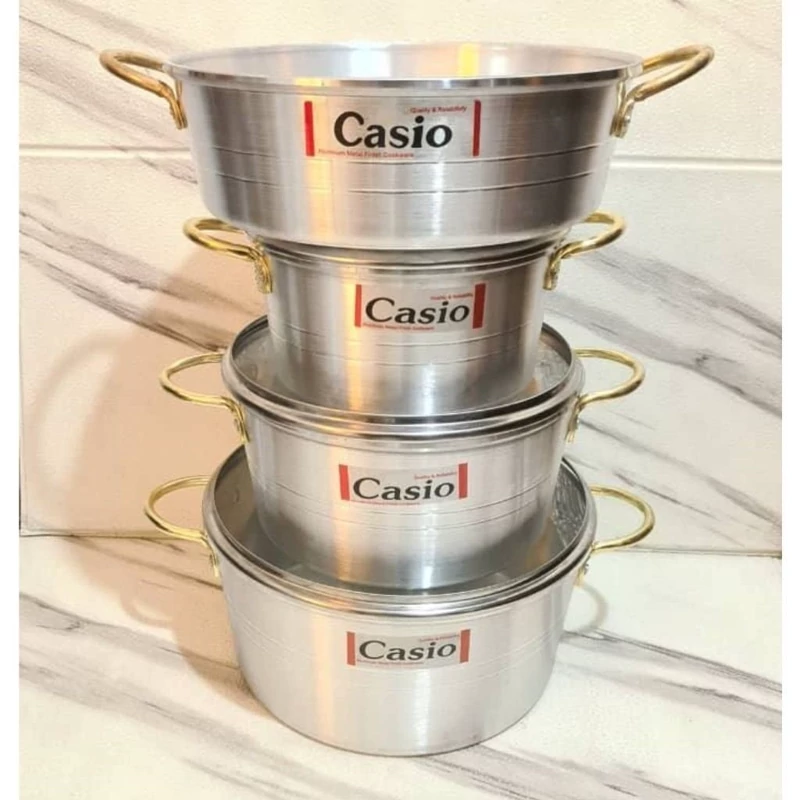 سرویس قابلمه کاسیو 7 پارچه میباشد، که شامل 3قابلمه و 3درب شیشه ای پیرکس و 1تابه است، دسته های آن نیز طلایی رنگ ، و لبه دار میباشد، همچنین برند کاسیو در داخل قابلمه ها کاملا واضح حک شده است.سرویس قابلمه 7 پارچه Casio بسیار ضخیم و سنگین هستند از جنس بدنه فوق العاده عالی و با دوام برخوردار است، قابلمه های این ست در سایز های :20،16، 26 و تابه 26موجود هستند.