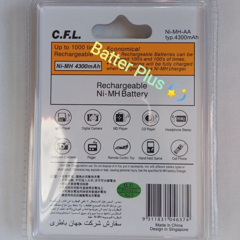 باتری شارژی قلمی دوتایی C.F.L از تکنولوژی نیکل متال هیدرید فلز در ساخت آن استفاده شده است. که امکان شارژ شدن مجدد باتری را فراهم میکند و شما را از دردسرهای تهیه باتری جدید نجات میدهد.
