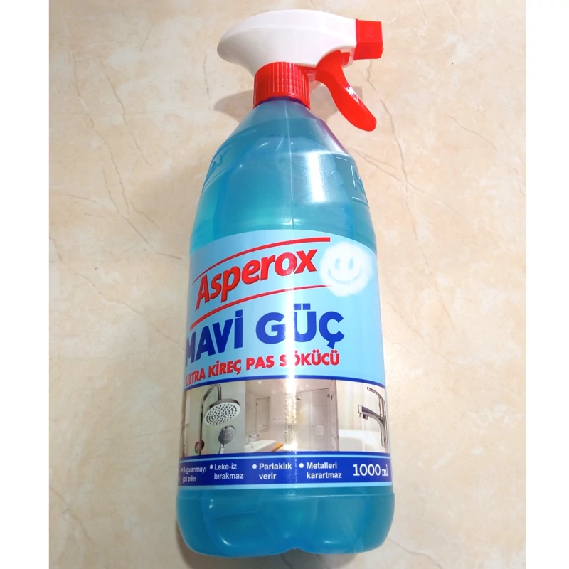 اسپری تمیز کننده سطوح Asperox با فرمولاسیون ویژهای که دارد، بهراحتی رسوبات آهکی شیرآلات، لکههای سطوح فلزی، گچی و سنگی آشپزخانه و سرویس بهداشتی و … را در کسری از ثانیه پاک میکند.