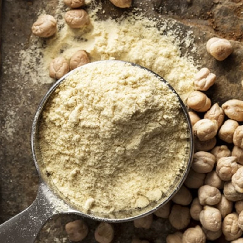 آرد نخودچی از آرد شدن نخودچی خام، بدون پوست و بدون نمک درست میشه و در غذاهای مختلفی مثل کوفته تبریزی، کتلت، کباب تابه ای، کوفته برنجی، فلافل و انواع شیرینی استفاده می شه\nآرد نخودچی برای پوست خیلی خوبه یعنی جوری که خیلی از ماسک های حرفه ای حاوی آرد نخودچی هستن اگر اهل تقویت پوست تون هستید بدونید که آرد نخودچی برای روشن کردن پوست، از بین بردن جای جوش و لک و این موارد حسابی موثره ، به تقویت رشد مو هم کمک میکنه \nاز نظر خوراکی هم دارای آهنه، برای کم خونی، رشد جنین و تحکیم استخون ها عالیه \n
