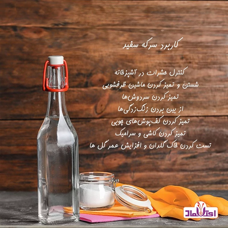 سرکه سفید چیست؟ سرکه سفید یا سرکه الکل یک محلول آبی است که حاوی حدود 5 تا 10 درصد اسید استیک است. اسید استیک یک ترکیب آلی است که از تخمیر الکل به وسیله باکتریهای اسید استیک ایجاد میشود. سرکه سفید معمولاً از تخمیر اتانول یا اتیل الکل که از ذرت، گندم، جو یا سیب تولید میشود، به دست میآید. این سرکه دارای بوی تند و ترش است و در دمای اتاق نگهداری میشود. سرکه سفید را میتوان با آب یا مواد دیگر ترکیب کرد تا درصد اسید آن را تنظیم کرد.