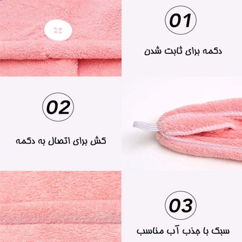 حوله سر خشک کن ، محصولی جدیدی که می تواند بسیاری از مشکلات شما در رابطه با خشک کردن و همچنین پوشش موهای خیس پس از شست و شو را برطرف کند . شکل ظاهری حوله سر جادویی شبیه به یک مثلث طراحی شده که یک طرف آن پهن تر و سمت دیگر باریک تر می باشد . این شمایل حوله به شما امکان پوشش کامل و در عین حال ساده تر موهای بلند را خواهد داد . در قسمت باریکتر حوله ، کش کوچکی تعبیه شده که این امکان را برای شما محیا می کند تا پس از پوشش موها بتوانید آن را به دکمه قرار گرفته بر روی قسمت پهن تر متصل نمایید ، به همین سادگی حوله بر روی سر شما ثابت و یا اصطلاحاً بسته می شود بدون اینکه مشکلاتی نظیر باز شدن ناخواسته حوله سر و یا تغییر فرم اولیه آن بر روی سر خود را داشته باشید . حوله سر دکمه دار دارای تنوع رنگ بسیار زیبایی می باشد که قرار گیری یک طرح فانتزی بر روی قسمت پهن تر آن توانسته بر زیبایی و جذابیت بیشتر کالا بیافزاید . از حوله کلاهی علاوه بر منزل می توانید داخل استخر و هتل نیز استفاده کنید .
