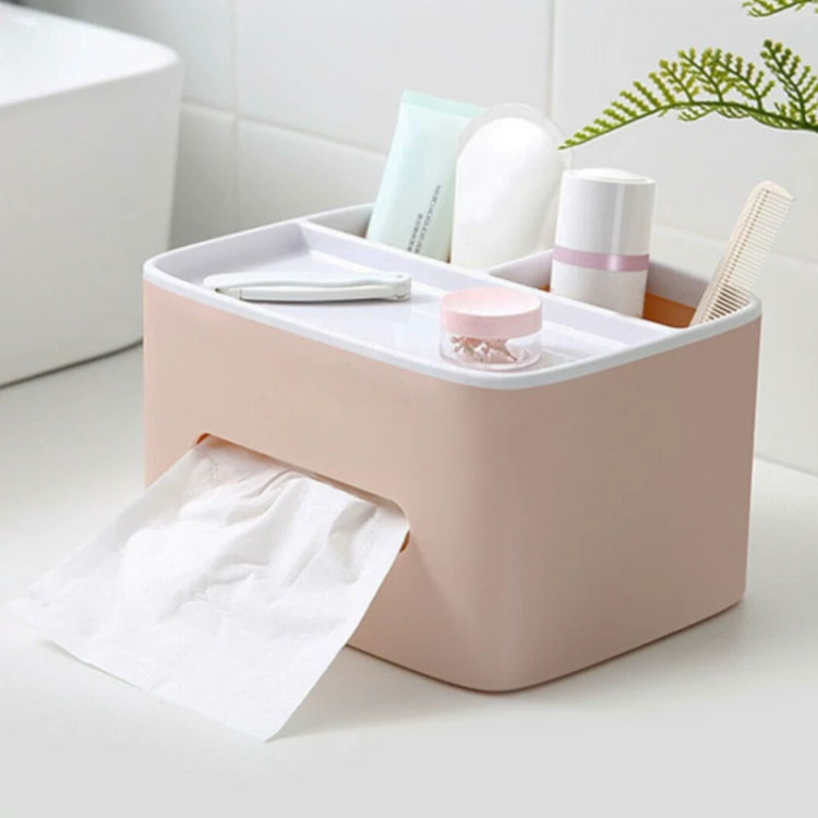 جعبه دستمال کاغذی چند منظوره ، محصولی جدید و زیبا از نوع رومیزی ، همراه با عملکردی کاربردی است . این جعبه از جنس پلاستیک مقاوم و با کیفیت تولید شده که امکان استفاده از آن را در شرایط مختلف از جمله رطوبت بالا محیا نموده . باکس دستمال کاغذی چند منظوره ، شامل چهار فضا در ابعاد مختلف می باشد که یکی از آنها محفظه بسته درب داری است که مخصوص نگهداری دستمال کاغذی طراحی شده است . در جلوی باکس نیز خروجی دستمال تعبیه شده تا بتوانید بدون نیاز به باز و بسته کردن درب و به سادگی در صورت نیاز ، به دستمال کاغذی دسترسی داشته باشید . درب جادستمال کاغذی نیز بر روی خود فضایی دیواره دار با ارتفاع کم برای قرار دادن لوازم و وسایل مختلف مانند موبایل دارد . در پشت جعبه دستمال کاغذی فانتزی دو محفظه دیگر در کنار هم وجود دارد که بسته به نیاز می توان برای جای دادن لوازم مختلف همانند کنترل ها ، لوازم تحریر و ... بهره برد . این محصول در رنگ صورتی روشن ارائه می شود که می توان علاوه بر دستمال کاغذی ، برای نگهداری لوازم و وسایل مختلف روی میز کار ، میز تحریر ، میز آرایش ، آشپزخانه ، سرویس بهداشتی و ... استفاده نمود .