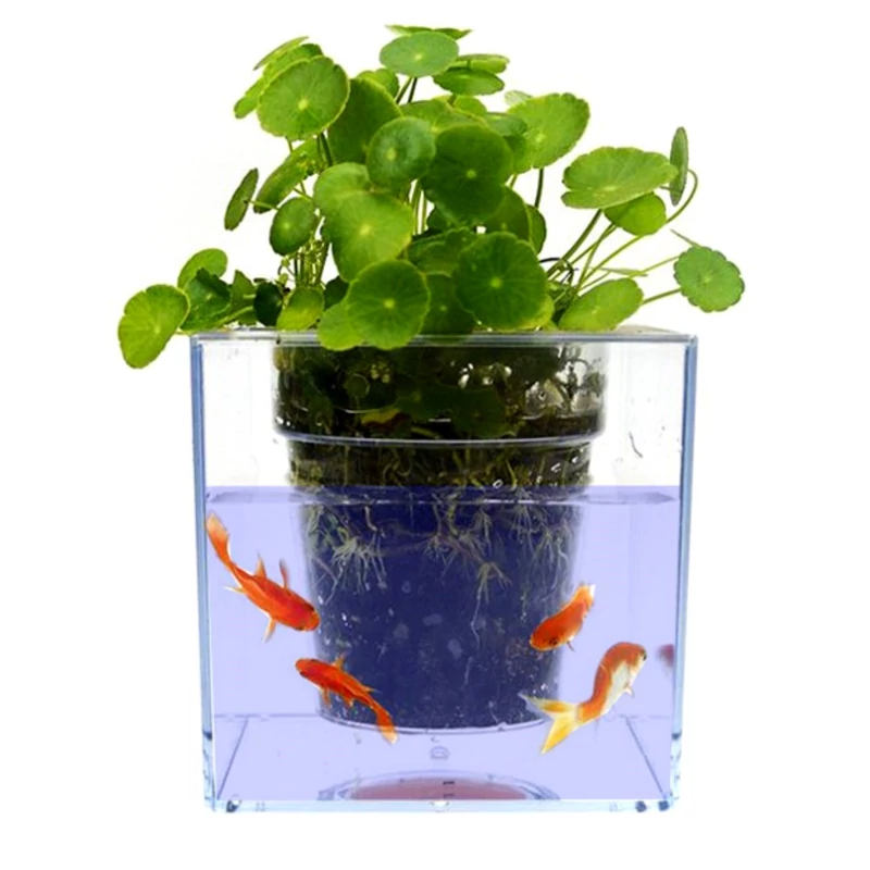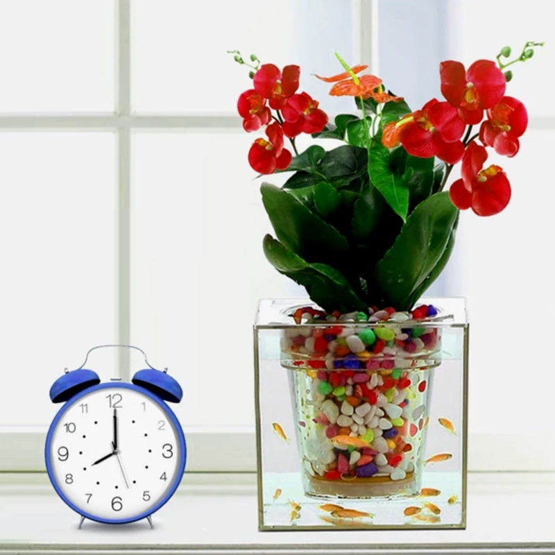 گلدان آکواریومی از سری لوازم تزئینی لوکس و مدرن است که امکان نگهداری انواع گیاه و آبزیان را به صورت همزمان در یک جا فراهم می کند. این آکواریوم دارای یک استند برای نگهداری گلدان است که می توانید گل های زینتی ، سبزه ، کاکاتوس و . . . را بر روی آکواریوم خود داشته باشید. بدنه این آکواریوم از جنس اکرولیک شفاف می باشد و با قرار دادن گلدان داخل محفظه تعبیه شده این گونه به نظر میرسد که گلدان در میان آب و ماهی های آکواریوم به صورت شناور قرار گرفته است و ماهی ها می توانند به سادگی اطراف گلدان حرکت کنند.