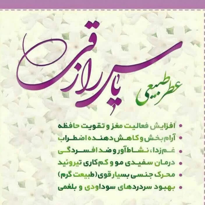 ♦️ عطر طبیعی یاس رازقی برکت، به دلیل طبیعت گرمی که دارد، باب طبع سوداوی مزاجهاست و برای درمان سردردهای سوداوی و بلغمی و بهبود افسردگی بسیار مناسب است.