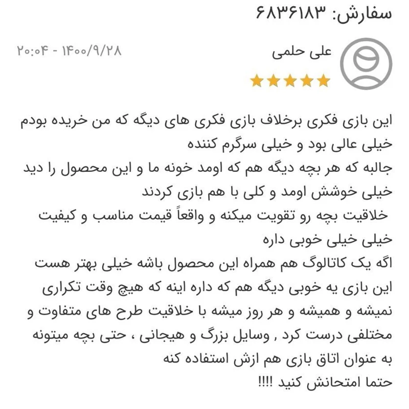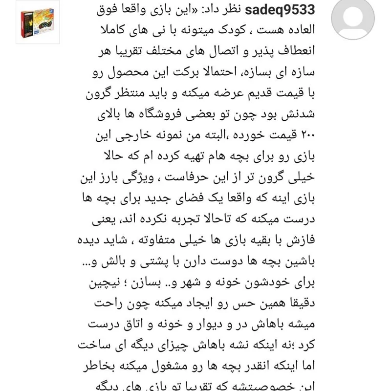 راستش اولش خودمم شک داشتم که آیا این اسباب بازی رو وارد «برکت» بکنم یا نه؟ آخه راستهی کاری ما موادغذایی بود نه اسباب بازی. اما وقتی یکی از اونها رو برامون فرستادن و دیدم که چطور معصومه خانوم ۸ ساله، انسیه خانوم ۶ ساله، آقا محمد حسن ۲/۵ سالهمون و حتی بالاتر آقا محمد مهدی ۲۰ ساله و باز بالاتر بگم آقاجون ۴۷ ساله جذب بازی شدن با خودم گفتم خوبه که این بازی رو بیارم توی «برکت» تا تمام دوستان برکتی هم بتونن با تهیهی اون روزهای پر نشاطی رو در کنار خانواده تجربه کنن.