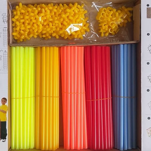 این اسباب بازی شامل ۲۵۰ قطعه (شامل ۱۳۶ عدد نی دار پنج رنگ جذاب و ۱۱۴ عدد اتصالات) میباشد.