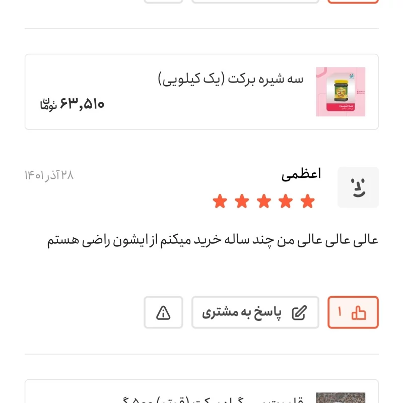☘ سه شیره برکت را با کیفیت بالا و ضمانت بازگشت وجه از فروشگاه اینترنتی برکت بخرید. برای خرید سه شیره به بالای صفحه بروید و روی دکمه «اضافه به سبد خرید» کلیک کنید.