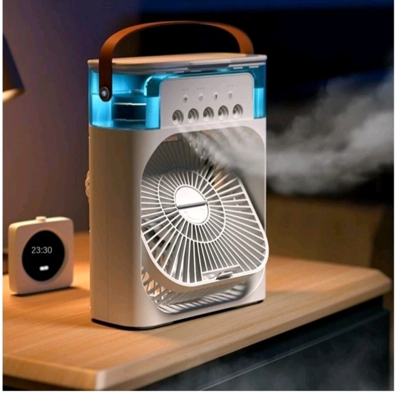 پنکه مه پاش رومیزی مدل Air Cooler Fan فاقد باتری است و به صورت مستقیم توسط آداپتور و کابل USB Type C به برق متصل میشود. دارای پنج نازل مه پاش قوی و قابلیت تنظیم تعداد مه پاش ها است. دارای پد خوشبو کننده و تایمر جهت خاموشی خودکار می باشد. فن دستگاه قابلیت تنظیم دستی و چرخش 360 درجه در یک جهت را دارد و محافظ فن دارای قابلیت باز و بسته شدن جهت نظافت پره ها میباشد. ترجیحا از آب تصفیه شده درون دستگاه استفاده شود جهت جلوگیری از رسوب.