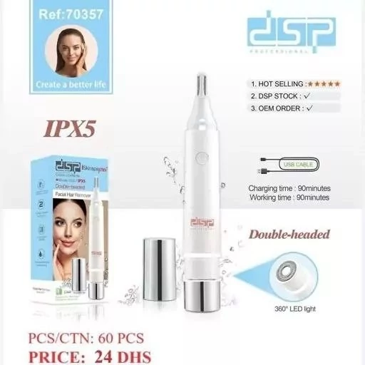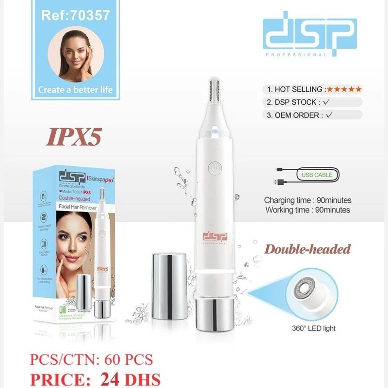 ماشین اصلاح صورت دی اس پی مدل 70357، دستگاهی دوکاره با قابلیتهای حذف موهای صورت و موزن سبیل است. با توان 3 وات و باتری لیتیوم-یون، این دستگاه ضد آب (IPX5) است و دارای پورت شارژ Type-C برای شارژ سریع میباشد. زمان شارژ و استفاده هر کدام 90 دقیقه است. به همراه دستگاه، برس، کابل Type-C و دفترچه راهنما ارائه میشود.