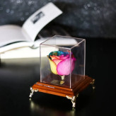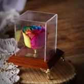 گل رز جاودان هفت رنگ با باکس چوبی قهوه ای پایه فرشته مدل درخشنده (عالیجناب)
