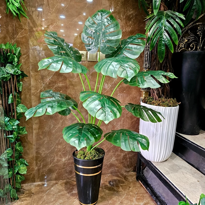 درختچه مصنوعی برگ انجیری 12 برگ درشت عالیجناب با ساقه های محکم و قابل انعطاف بسادگی حالت پذیر بوده و براحتی به سلیقه مشتریان عزیز ؛ در دیزاین به حالت گرد و یکطرفه قابل تغییر می باشد،گلدان محصول به سلیقه مشتری در دو رنگ سفید و مشکی موجود می باشد ، برگهای لمسی سایز بزرگ و شباهت به برگهای طبیعی درختچه انجیری از مزایایی این محصول می باشد .