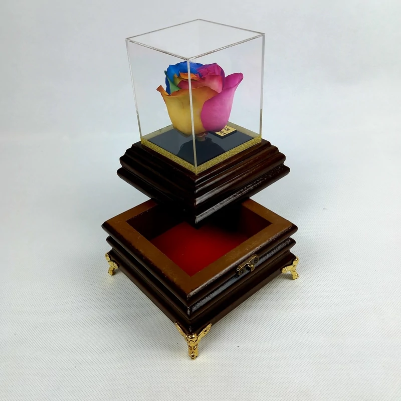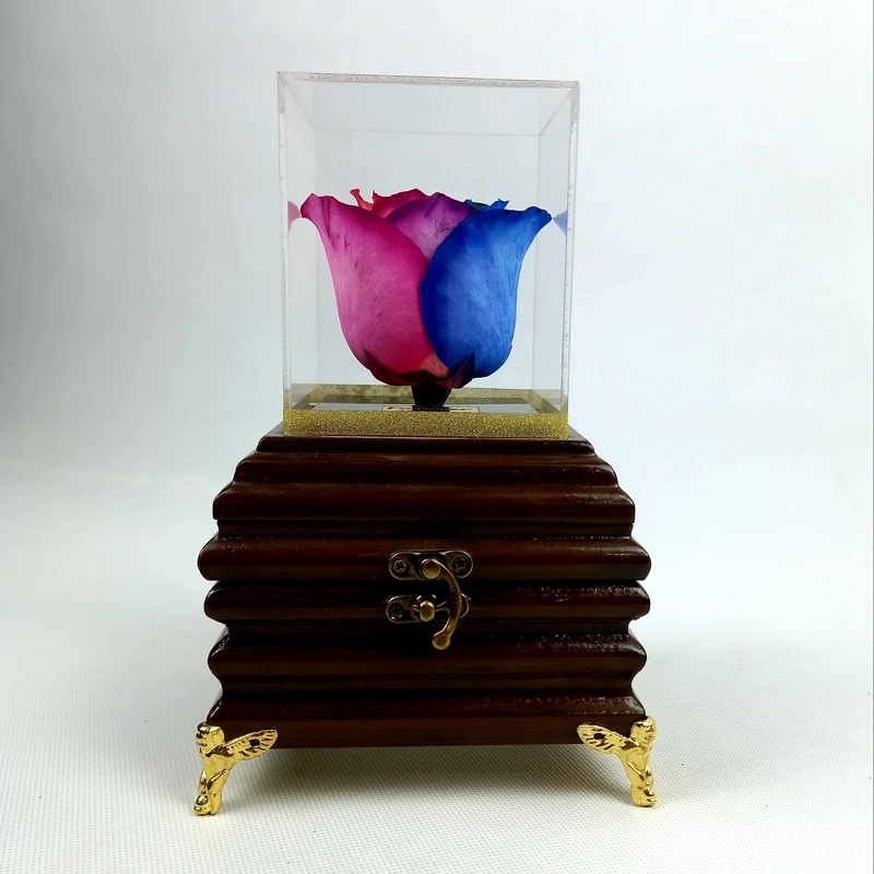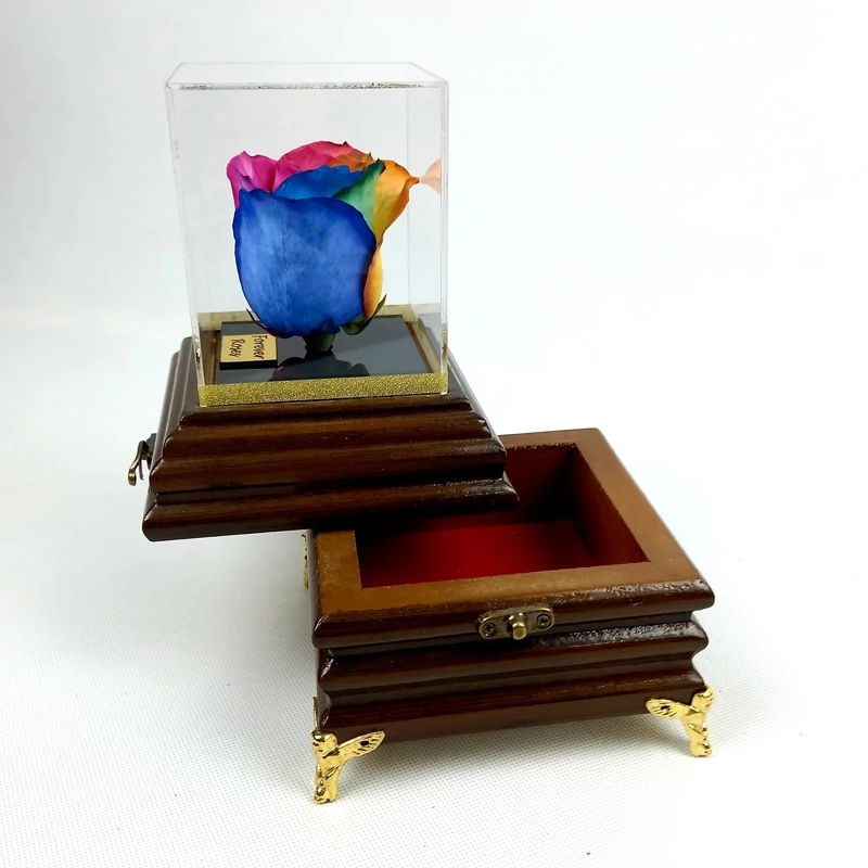 گل رز جاودان هفت رنگ با باکس چوبی صندوقچه جواهرات با ضمانت 7 ساله عالیجناب