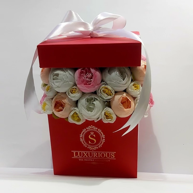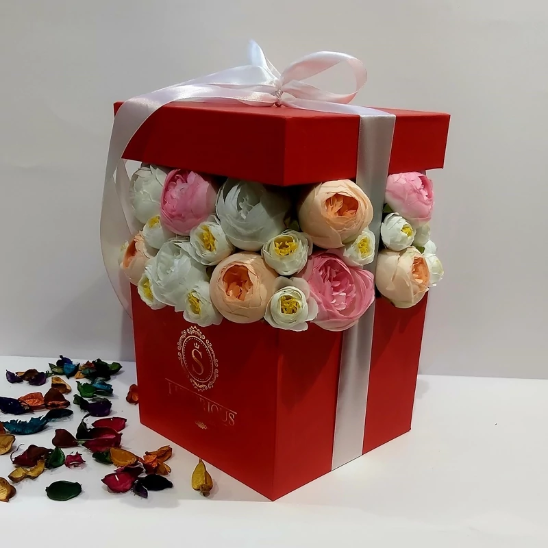 باکس گل مصنوعی شاهکار با طراحی بکر و چشم نواز و زیبایی خاص هر ببیننده ای را مجذوب خود می کند ، دیزاین گلهای زیبایی پارچه ای پیونی و نسترن مصنوعی و طرح نیمه باز باکس گل و تلفیق رنگی سفید ،صورتی و گلبهی و متد خاص و نوآورانه گل آرایی ، باکس گلی ایده ال خلق کرده که لایق عزیزان و بهترینهای زندگی شما باشد ،