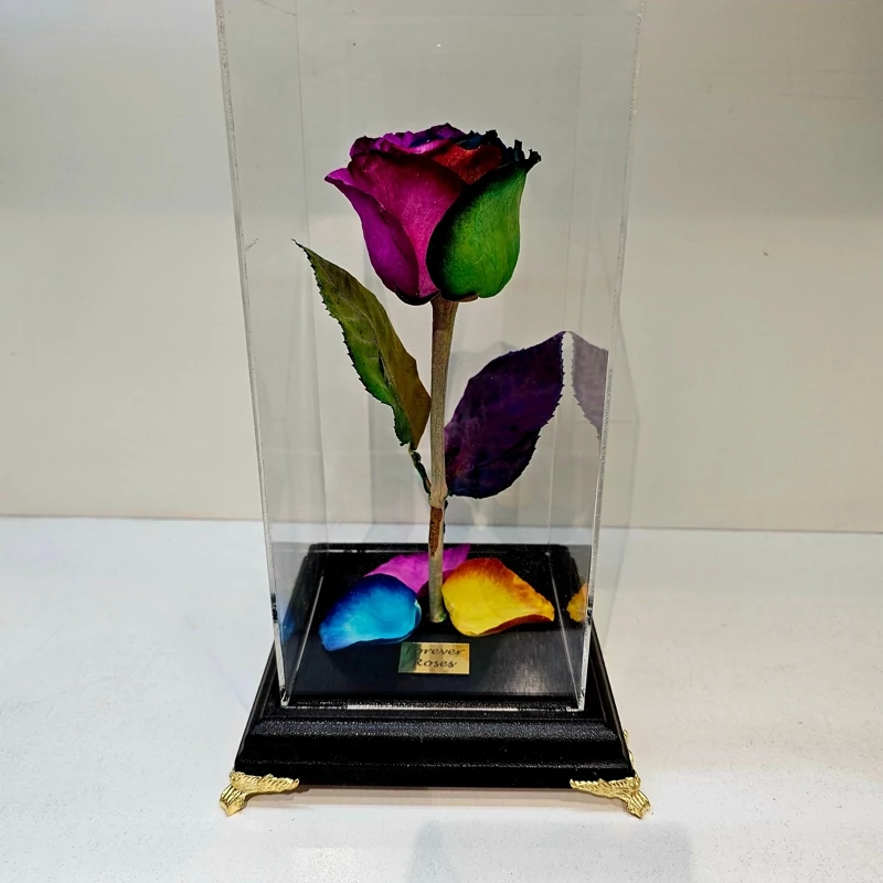 گل رز جاودان هفت رنگ با باکس دیو و دلبر پایه فرشته (عالیجناب)