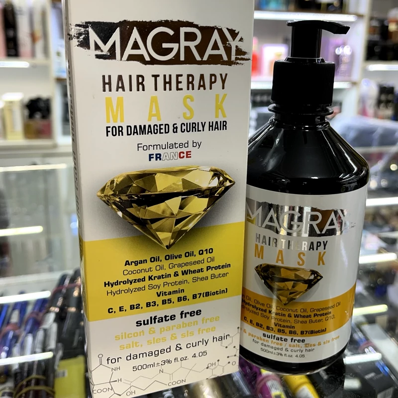 این ماسک مو حاوی روغن مغذی زیتون، نارگیل، هستهانگور و آرگان است که با پروتئینهای گندم و سویا هیدرولیز شده است. این ماسک مو دارای ویتامین C,E,B2, B3, B5, B6,B7 کراتین و شیباتر میباشد. این ماسک مو با داشتن این مواد مغذی موجب بازسازی و آبرسانی قوی موهای آسیبدیده و مجعد شما میشود. ماسک مو موهای آسیب دیده ومجعد 500میل MAGRAY بدون سولفات بوده و برای موهای آسیبدیده و مجعد و کراتینه مناسب است