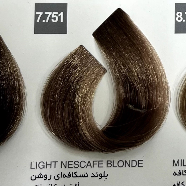 رنگ بلوند نسکافه ای روشن 7.751 ، رنگ مو کاترومر بدون آمونیاک و یک عدد اکسیدان 150 میلی لیتر