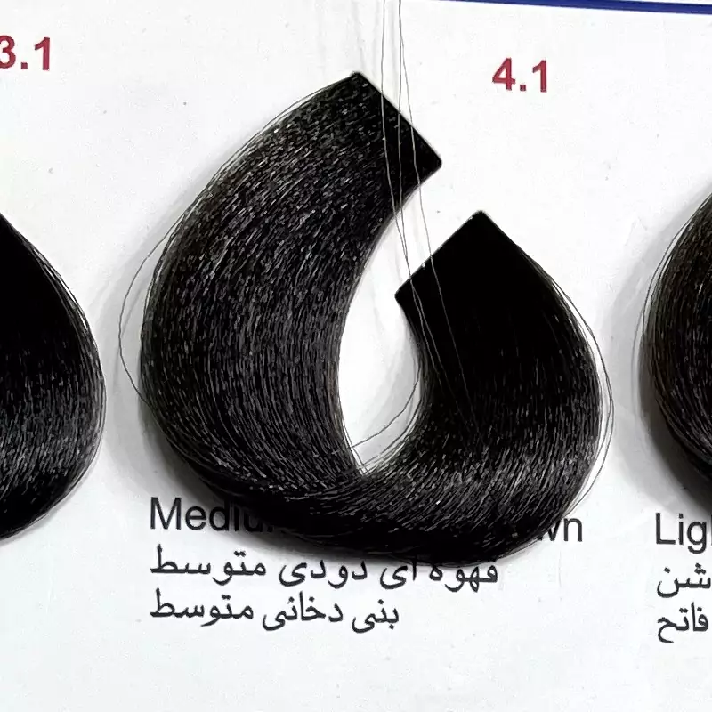 رنگ قهوه ای دودی متوسط4.1 ،رنگ مو کم آمونیاک پیلون و یک عدد اکسیدان