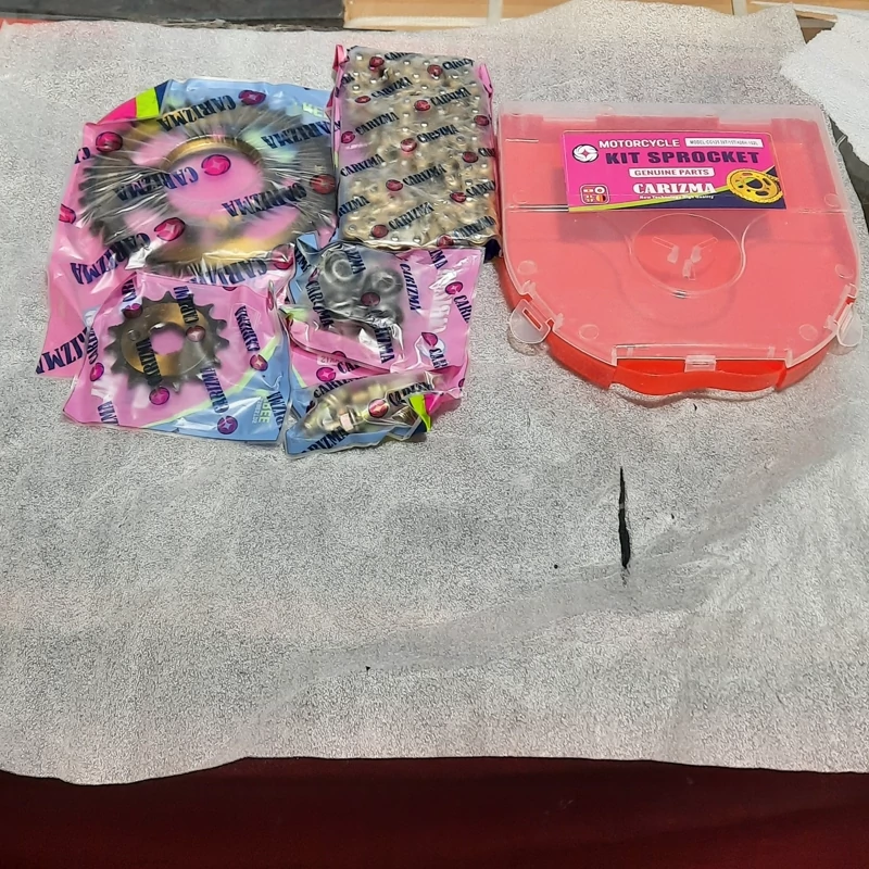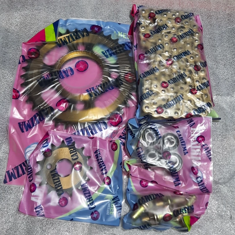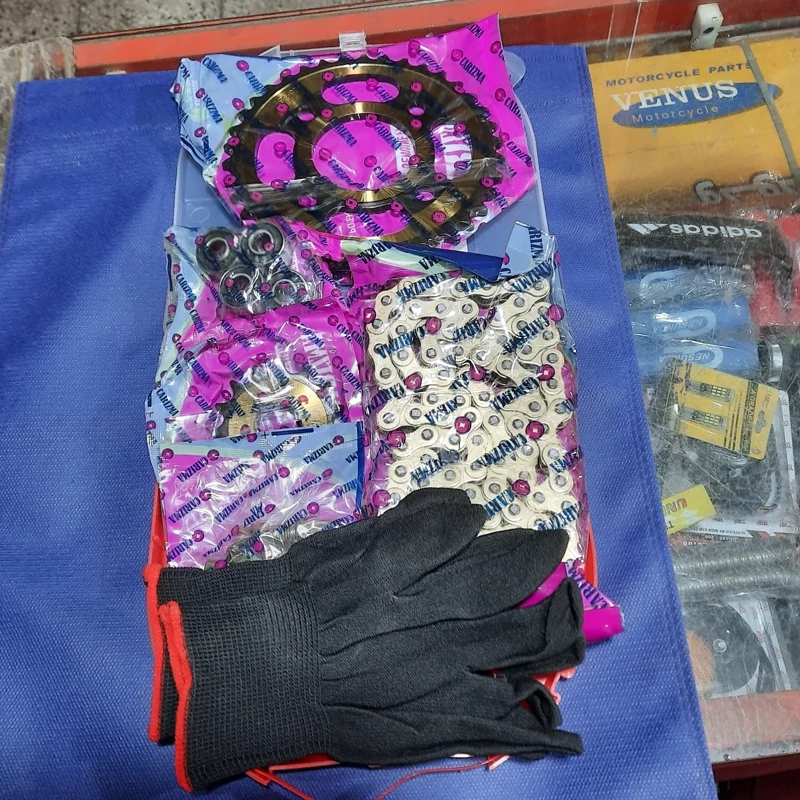 شامل دنده عقب فولادی دنده جلو فولادی.زنجیر طلایی با ضمانت .بوش عقب به همراه ۴عددپیچ دنده زنجیر