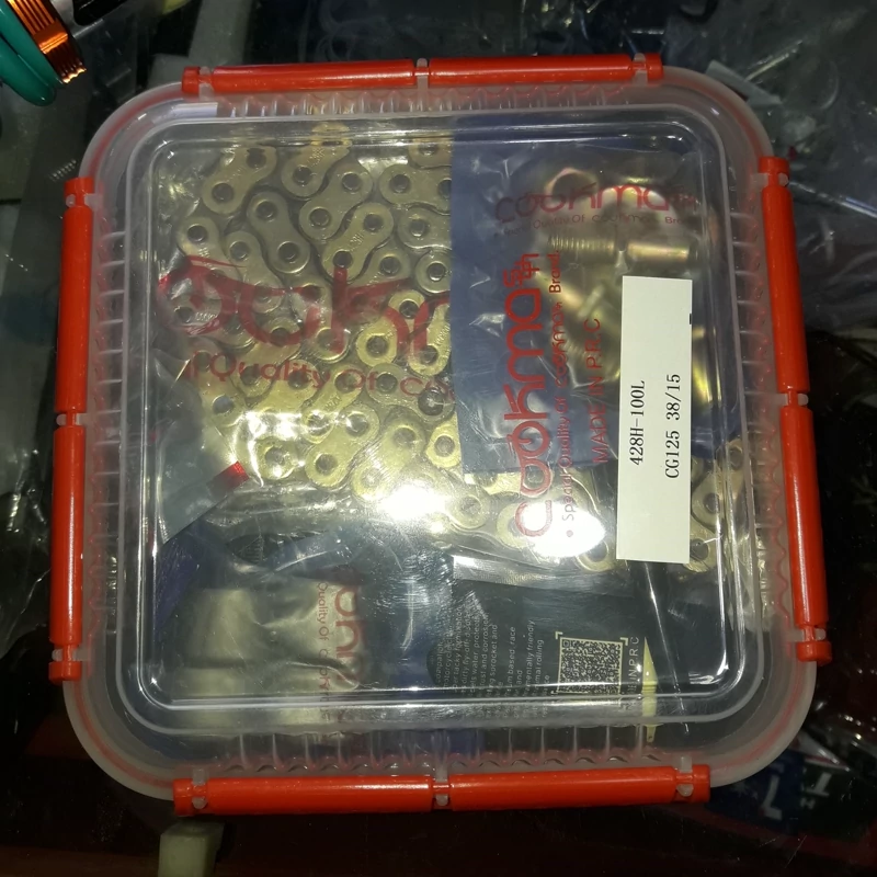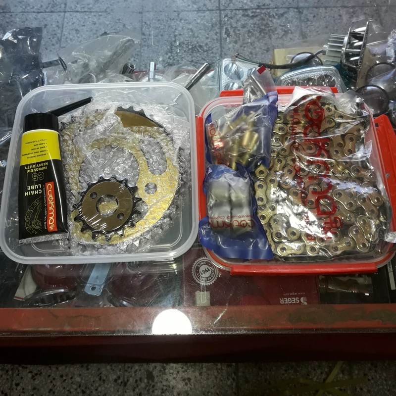 مرغوبترین دنده زنجیر ،دنده عقب وجلو فولادی ،زنجیر بوشدار وطلایی بدون شول وسفت شدن،دارای بوش چرخ عقب وپیچ دنده زنجیر وخار توپی عقب مخصوص زنجیر ،بسته بندی شکیل ومحکم