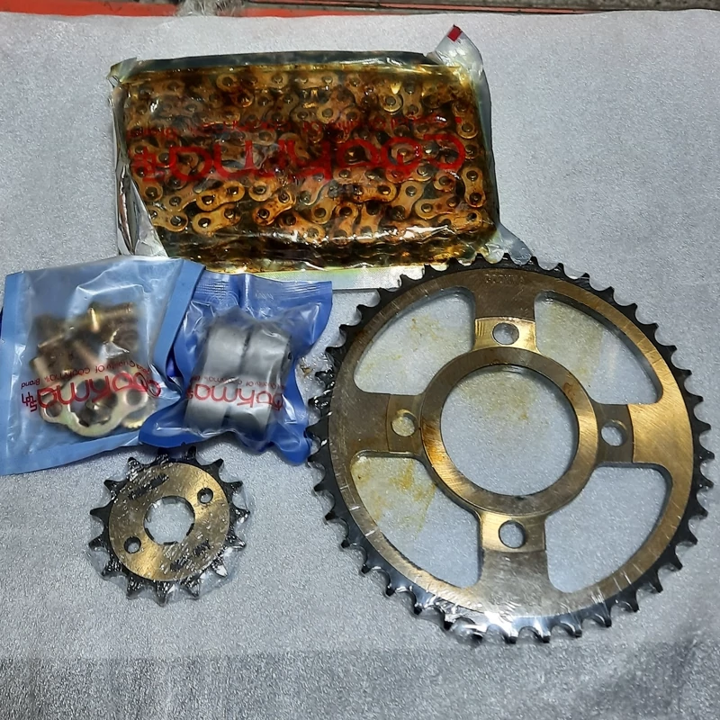 زنجیر طلایی ۱۰۸دانه .دنده عقب ۴۲دانه وصاف.دنده جلو ۱۵دانه بهمراه بوش وپیچ دنده زنجیر مخصوص سی جی ال واحسان شکاری