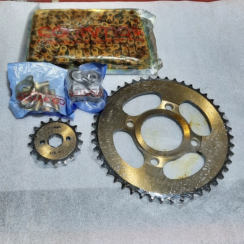 زنجیر طلایی و۱۲۸دانه.دنده عقب۴۷تایی ودنده جلو ۱۷تایی همراه با بوش وپیچ دنده زنجیر